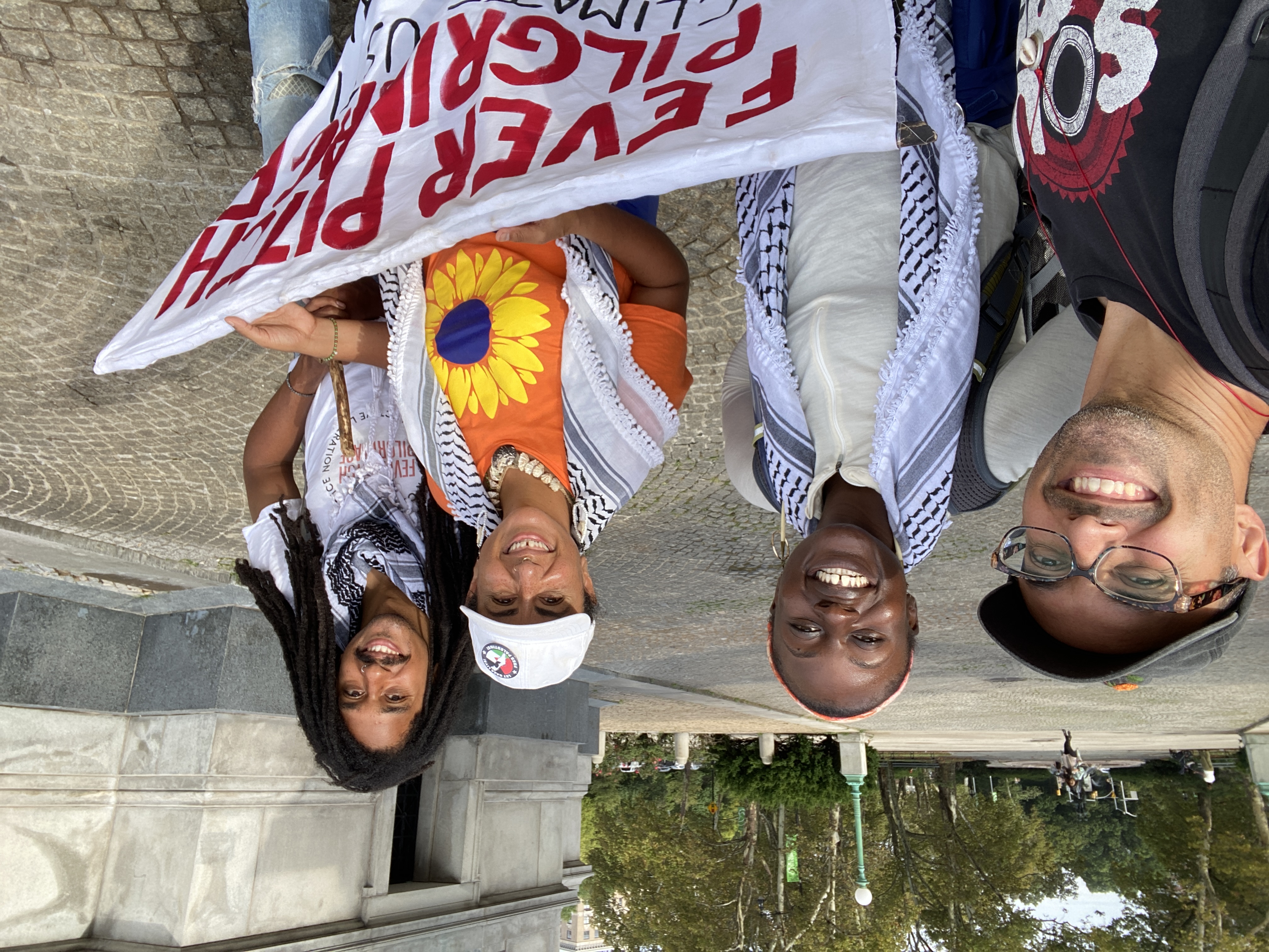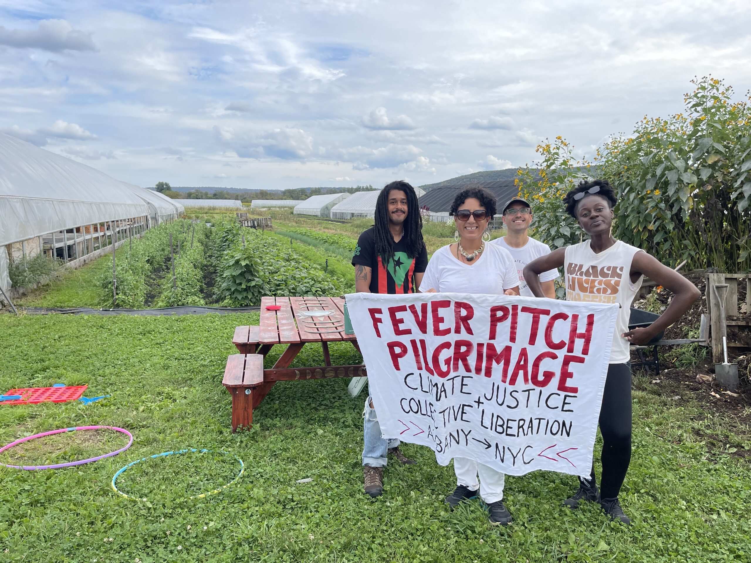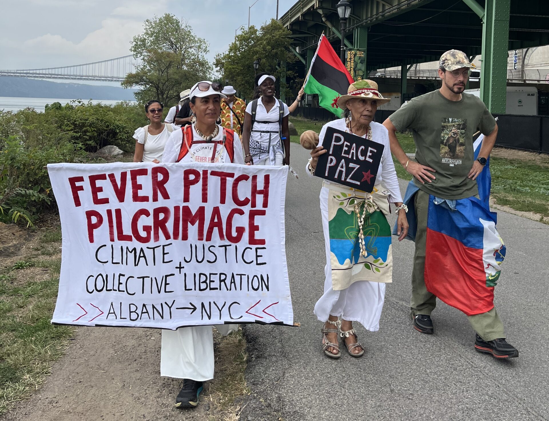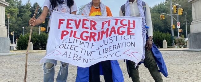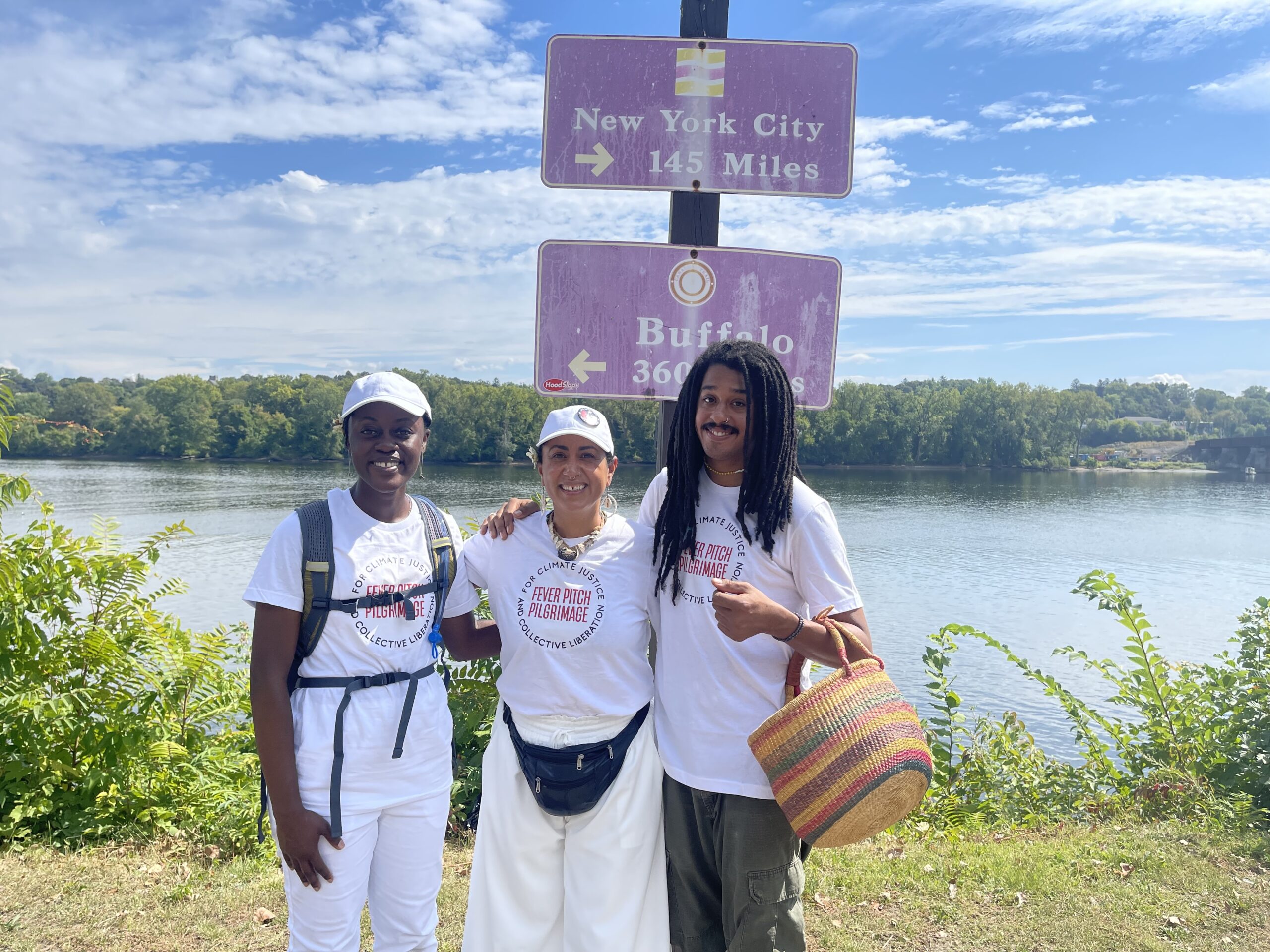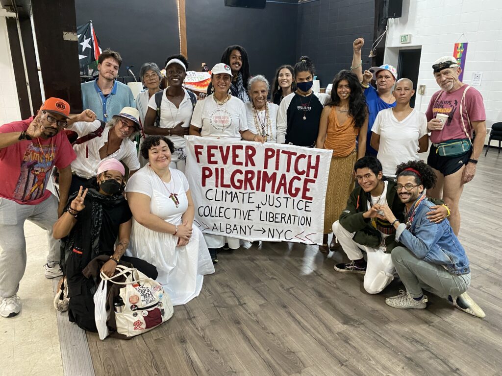 From September 13–27, 2025, I walked 156.3 miles from Albany to Brooklyn with my beloved artistic collaborators Eliana Rowe and Molefi Ramos on the Fever Pitch Pilgrimage, a living, breathing action and prayer for climate justice and collective liberation. Alongside us on the road, Gaetano Vaccaro drove an electric support vehicle, providing food, equipment, and logistical care that helped make our journey possible. What began as a vision inspired by peace walks, frontlines tours, and the work of environmental activists like John Francis, became a deeply spiritual and transformative experience—part performance, part protest, part prayer.