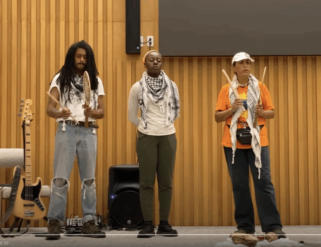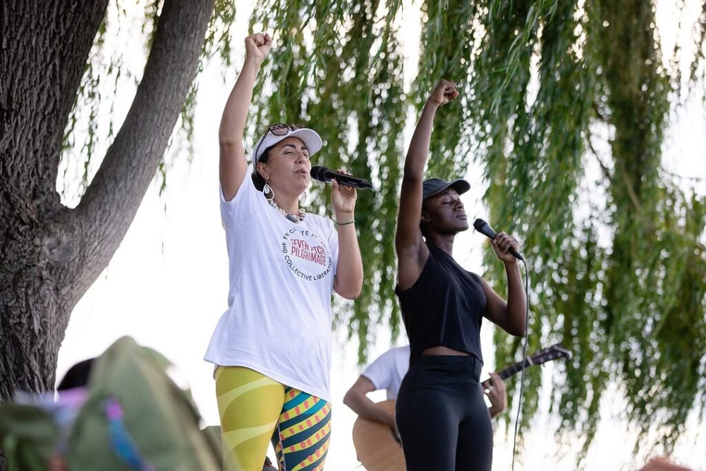 Each day of this journey, we walked an average of 15 miles, feet pounding pavement and hearts aligned with purpose, toward cities and towns where we offered our voices in song. These “song offerings” weren’t just performances. They were moments of intention, communication and connection, co-created with local organizations and communities working on issues related to climate justice, as well as movements for immigrant rights, racial and gender justice, abolition, and a livable future for all. We sang against the forces of climate devastation, war, incarceration, fascism, and genocide, and for joy, for life, for each other.