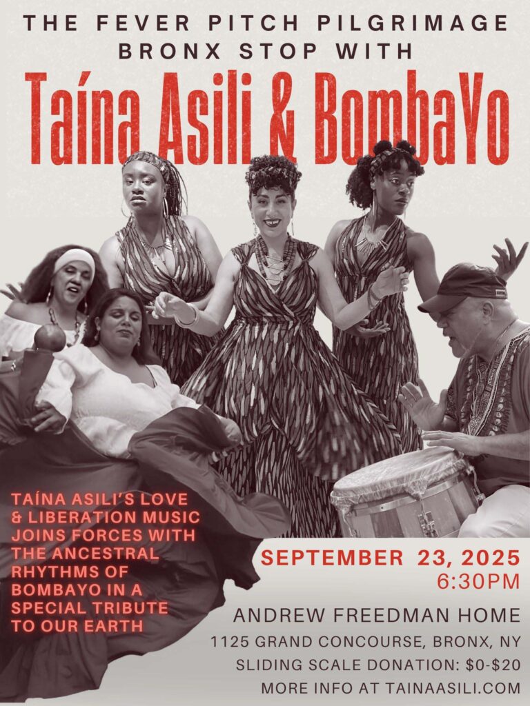 On September 23rd, the Fever Pitch Pilgrimage arrives in the Bronx for a one-time-only event at The Andrew Freedman Home, where Taína Asili joins forces with BombaYo in a powerful collaborative performance for climate justice. The Fever Pitch Pilgrimage is a 150-mile journey taking place September 13–27, 2025, in which Taína and her artistic team will walk from Albany to New York City, carrying a call for climate justice, collective healing, and a just future. Averaging 15 miles a day, they will arrive in NYC during New York Climate Week. This special Bronx stop celebrates their arrival in the city, blending the Ancestral rhythms of Afro–Puerto Rican bomba with select songs from Taína’s Fever Pitch show.